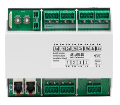 4E-AM448 is a DIN-rail mounted surveillance box with 4 amplifier inputs and 4 A/B loudspeaker outputs, dedicated for Impact SW and Impact MM voice evacuation systems. 4E-AM448 is also the backup amplifier manager, and therefore features additional backup amplifier input, which is shared by all 4 primary amplifier inputs.