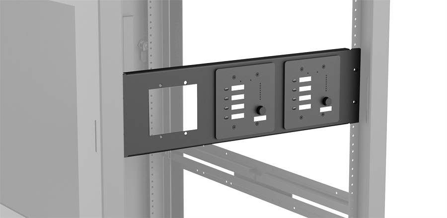 The BB-PLT-PNL is a 3RU accessory kit that allows mounting of up to 3 BlueBridge® wall plate controllers in a standard width equipment rack.