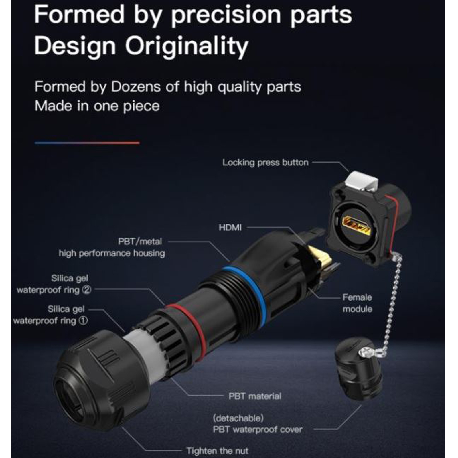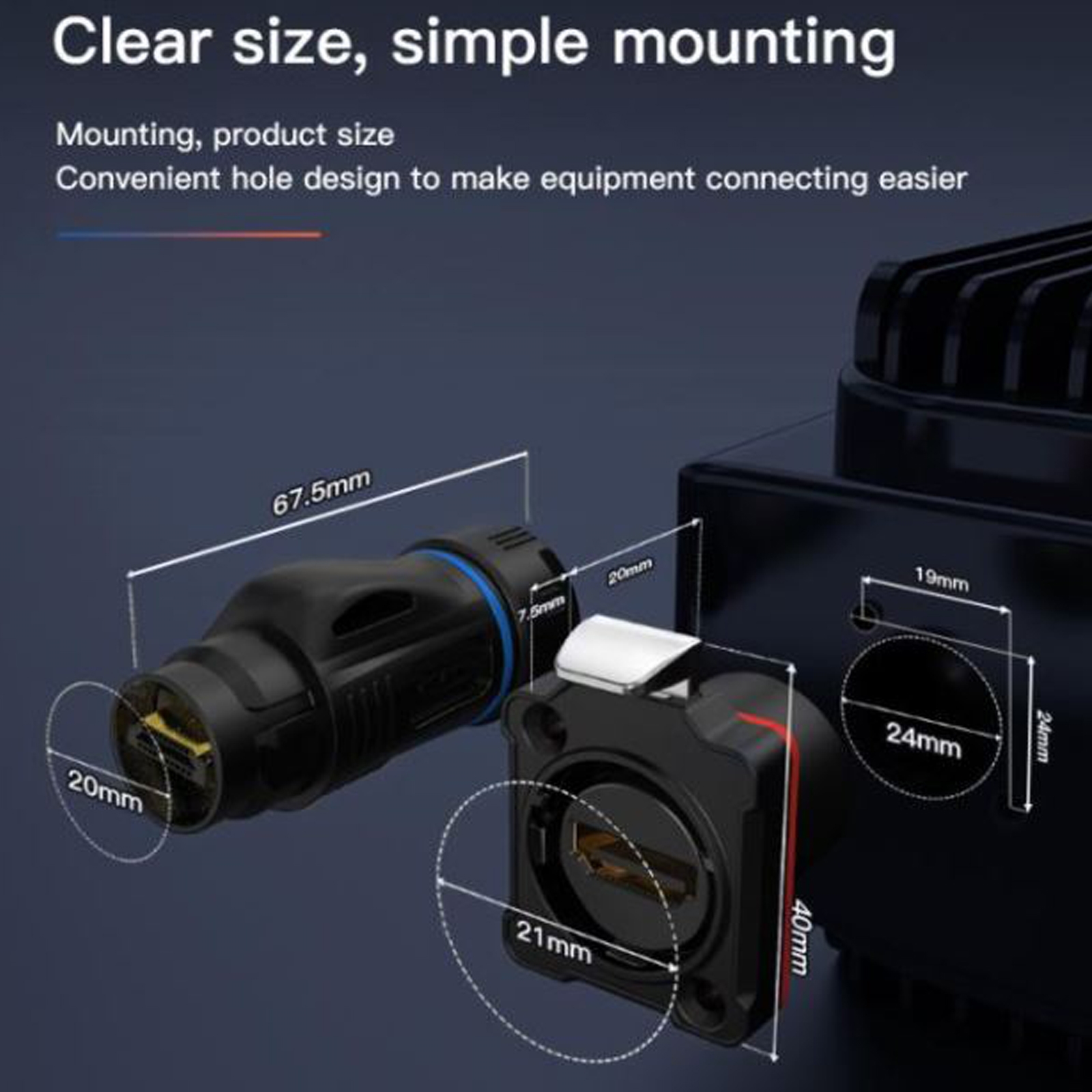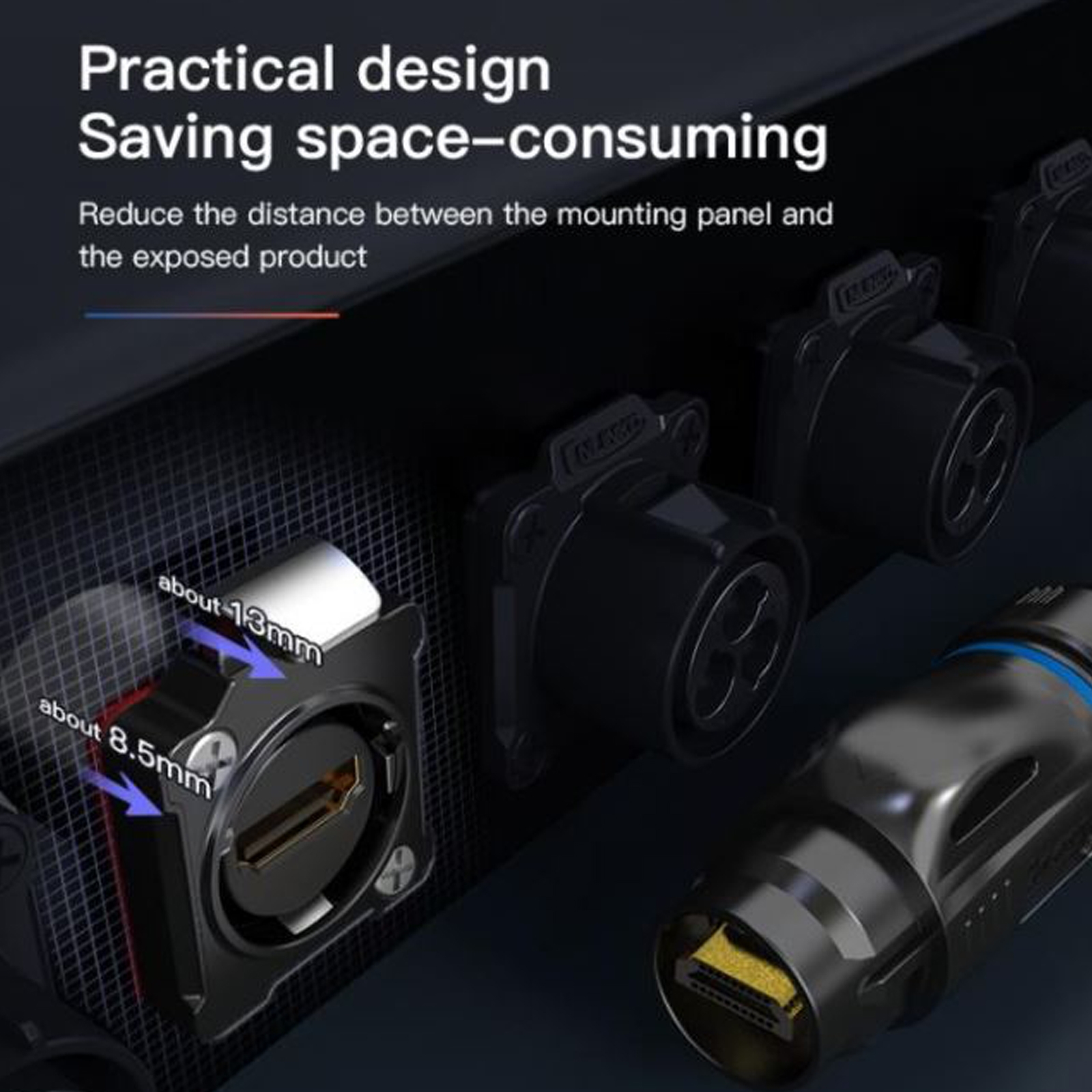 Die sichere HDMI Einbaubuchse für die Video Übertragung im industriellen Umfeld mit einer einer Breite von 30 mm.