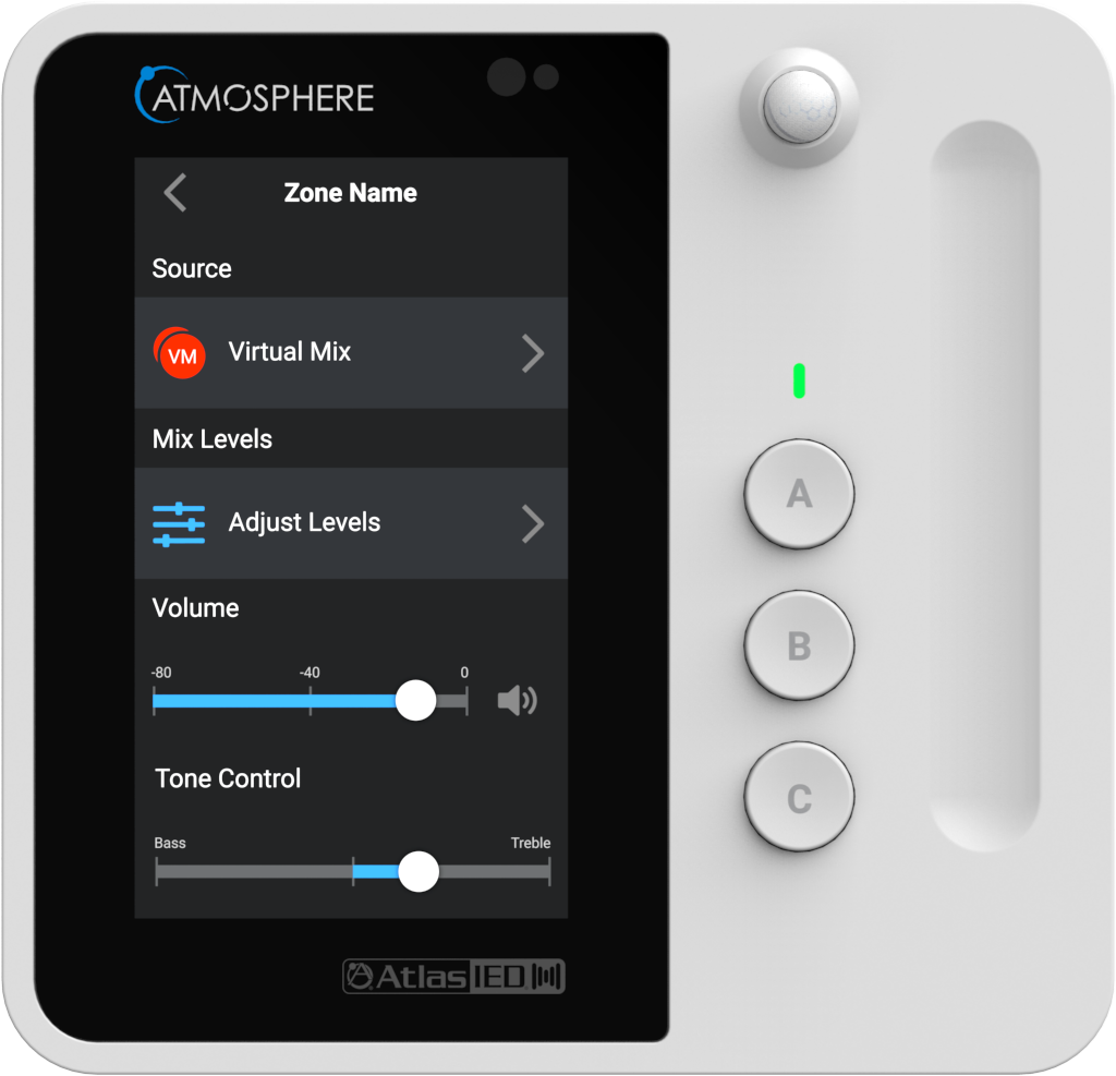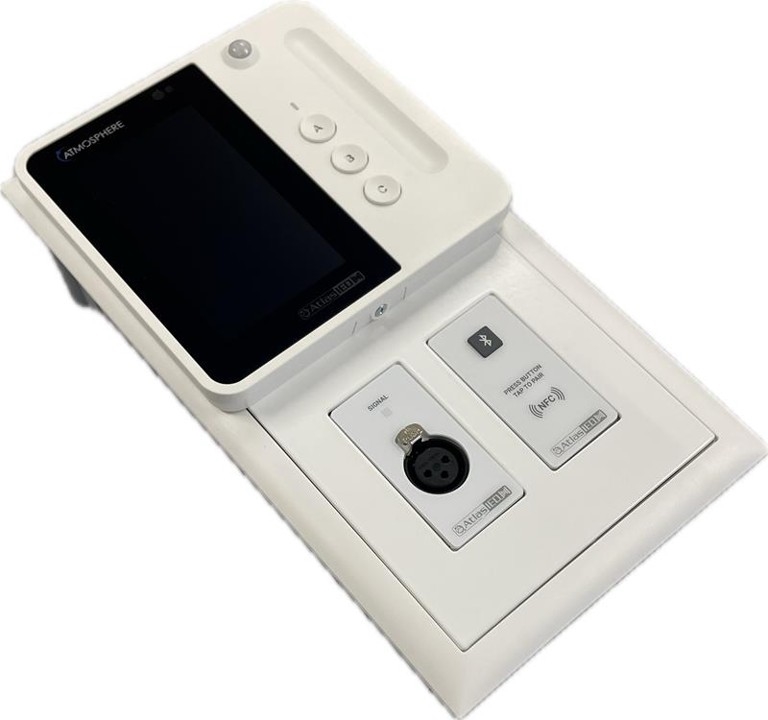 The AtlasIED Atmosphere C-T4 series wall controllers bring advanced functionality and intuitive design to the Atmosphere audio control system. Featuring a 4.3-inch programmable touchscreen, capacitive touch volume slider, and customizable action buttons, these controllers make managing zones, sources, and system actions effortless.