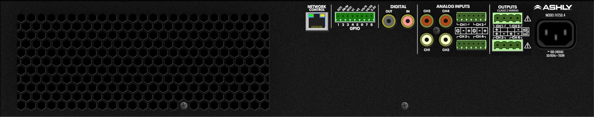 • FX can change gears to work for whatever type of speakers your system requires. Its multi-mode operation with switchable Low Z (4/8 Ohms) or Hi Z (70/100V) can be selected in software, so you can mix and match speaker types as needed. All models also offer convenient power-sharing technology that balances power between channels to meet different load requirements.