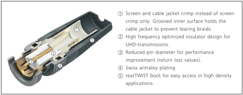 Die rearTWIST UHD BNC Steckverbinder wurden speziell für die Übertragung von hochauflösenden Videosignalen entwickelt. Durch das einzigartige Isolator- und Kontakt-Pin-Design bieten die Steckverbinder niedrige Rückflussdämpfungwerte für 4K und 8K Signale.
