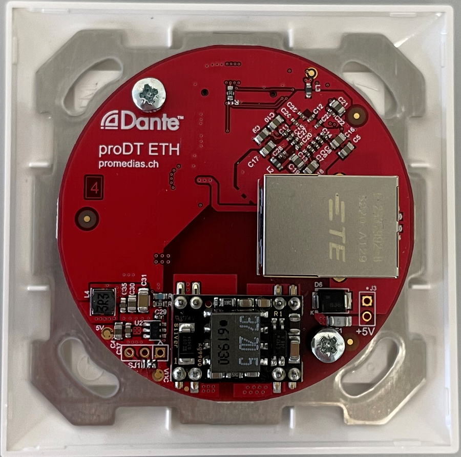 Die brandneue proDT® Serie, Eigenentwicklung der promedias AG und Produktion in der Schweiz, ist eine sehr kompakte und vielseitig einsetzbare Dante® Schnittstelle von und auf analoge Audioein- und -ausgängen. Kompakt in der Hinsicht, dass bis zu 2x2 IN/OUT Audiokanäle auf nur einer Grösse I (1x1) auf Feller EDIZIOdue Platz finden und bis zu 4x4 IN/OUT Audiokanäle auf einer Grösse I+I (1x2/2x1).