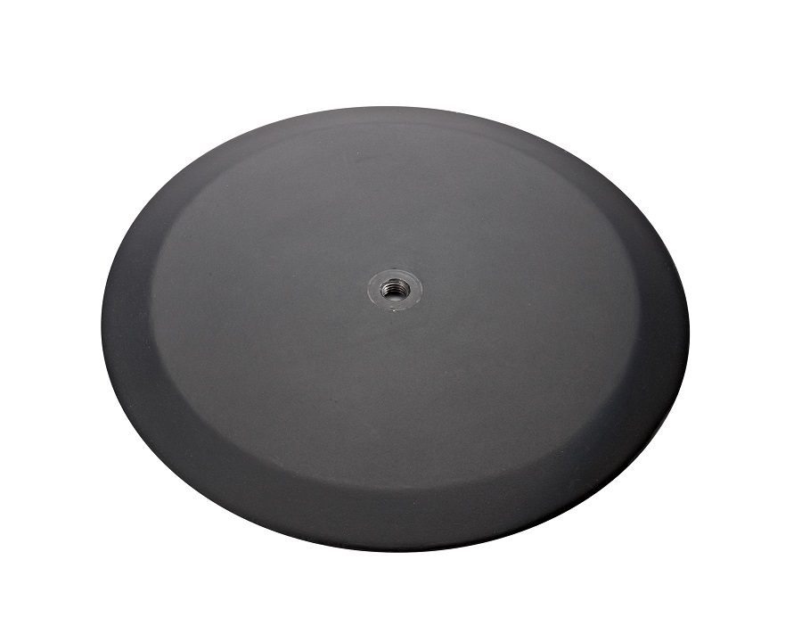 Flache Rundsockelplatte für alle gängigen Distanzstangen und Rohrkombinationen mit Gewindebolzen M20. Der Durchmesser beträgt 450 mm. Inklusive Filzstreifen zum Schutz des Fußbodens. Optional erhältlich ist die Tragetasche 26751.