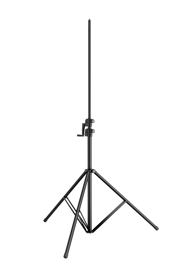 Professionelles Leuchten- und Boxenstativ mit neuartigem doppeltem Kurbelgetriebe. Die zweifach ausfahrbare Rohrkombination deckt einen Einsatzbereich von 1.715 bis 4.000 mm Höhe ab. Das Heben und Senken der Last erfolgen benutzerfreundlich, sicher und zuverlässig über zwei separate Kurbelgetriebe. Durch das integrierte »Auto Lock« System wird ein plötzliches Absacken der Last durch eine automatische Verriegelung verhindert.  Die Kurbel kann zudem gegen unbefugte Benutzung entnommen werden. Da keine Seilzüge zum Einsatz kommen, arbeitet das Stativ völlig wartungsfrei. Der Fokus bei diesem robusten Stativ liegt vor allem auf Stabilität und Kippsicherheit, sodass eine Traglast von 40 kg problemlos realisiert wird. Das kompakte Transportmaß beträgt 1.695 x 200 x 165 mm und das Gewicht liegt bei rund 14,2 kg. Über die integrierte Gewindebuchse M10 können zusätzlich Traversen oder einzelne Scheinwerfer direkt montiert werden.