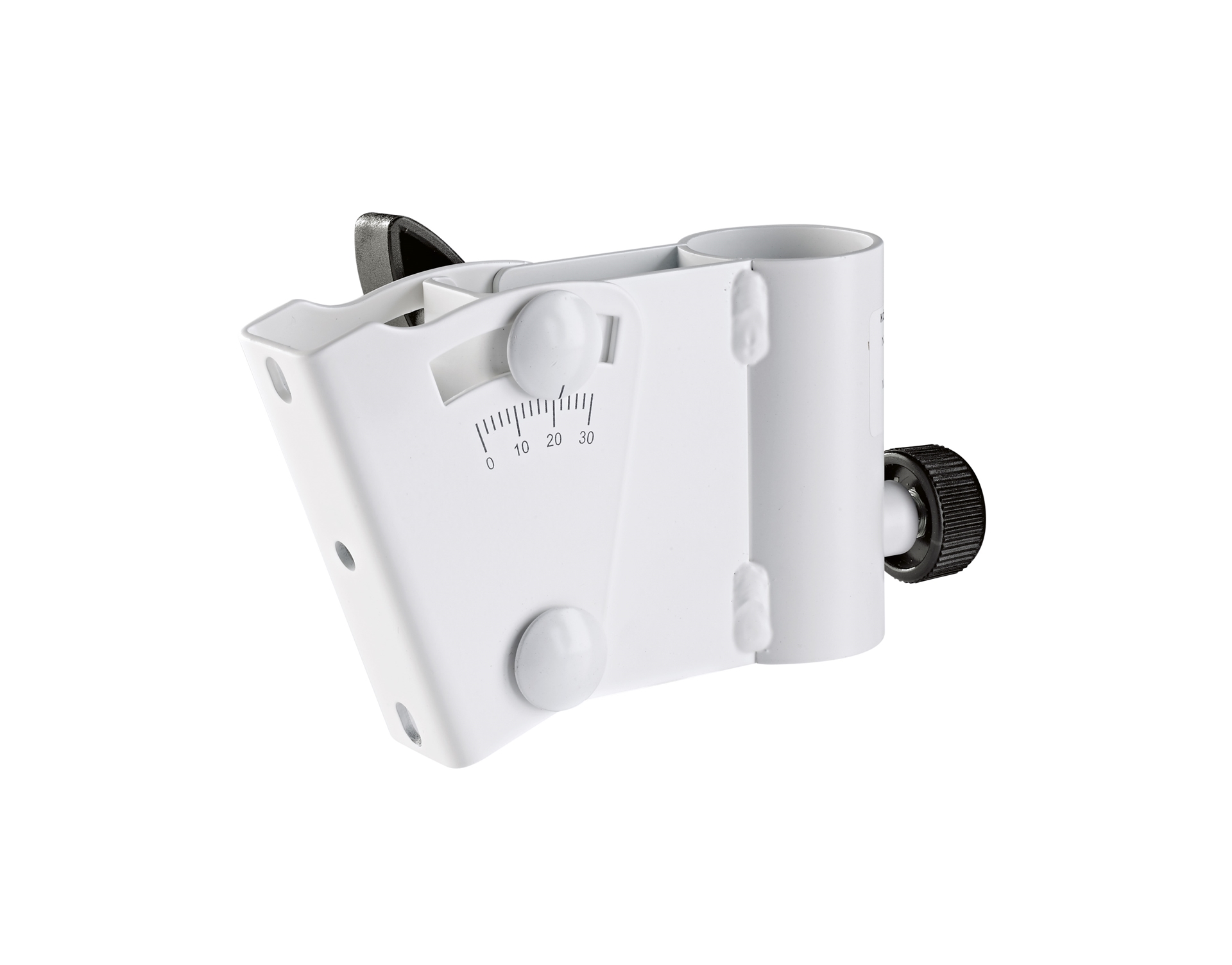 Mit dem Stativadapter können Lautsprecher oder Tonsäulen ohne eingebauten Flansch an Boxenstativen oder Wandhaltern befestigt werden. Die Aufnahme passt für alle Stative mit einem Rohrdurchmesser von 35 mm. Der Adapter kann in der Neigung bis zu 30° eingestellt und außerdem dank der Klemmschraube stufenlos in der Höhe befestigt werden. Zur einfachen Montage wird die Schwenkaufnahme vorab an der Tonsäule befestigt und danach bequem in die Halterung eingesetzt.