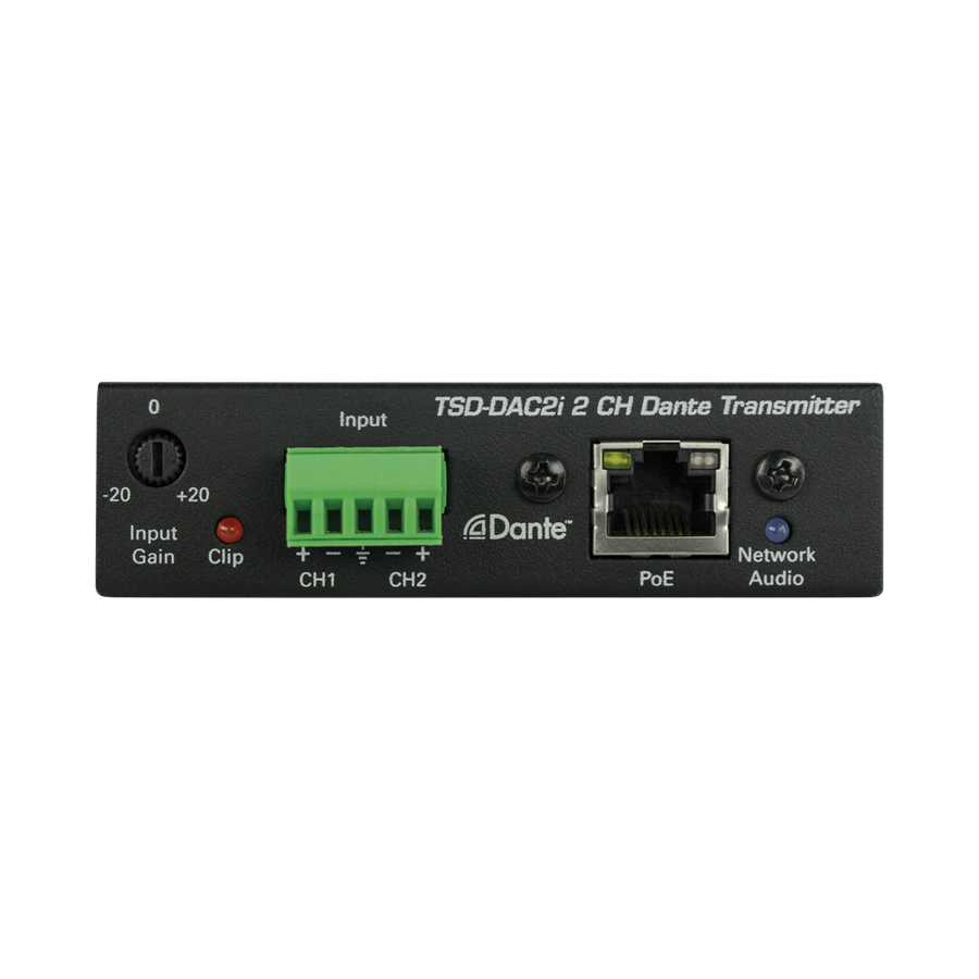 The AtlasIED TSD-DAC2i is a PoE 2-channel analog pre-amplifier that converts analog audio signals into Dante® digital audio. The TSD-DAC2i can be used for any Analog to Dante® digital audio end point but is ideally suited to be used with the AtlasIED WTSD wall mixer series. Once converted into Dante® digital audio, the audio can be transmitted over IP networks and routed in the Dante® Controller software. The TSD-DAC2i Dante® transmitter I/O module features two analog balanced line inputs with a variable gain to operate from line to mic level. An Input Clip indicator illuminates when clipping signals are present. There are indicators for Power and Network connection. The TSD-DAC2i requires no external power supply, it is powered via a network PoE port or a PoE cable power injector.