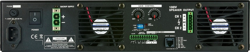 EN54-16 zertifizierter Klasse H Zweikanal Leistungsverstärker mit 24 Volt Notstromversorgung, Störmeldeausgang, Einschaltstrombegrenzung und Softstart, Ringkern-Netztrafo sowie zwei eingebaute Lüfter mit temperaturgesteuerter Drehzahlregelung, integrierte elektronische Schutzschaltung gegen thermische Überlastung, DC Signale, subfrequente Signale, Kurzschluss, offene Ausgänge und HF-Einstrahlung Getrennt rastende Pegelsteller für EingangsVerstärker pro Kanal Getrennte LED-Statusanzeige pro Kanal für CLIP,